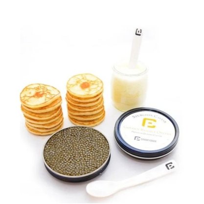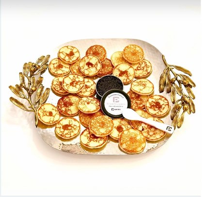 Caviar is a delicacy that can be eaten alone, as a side or appetizer and a great addition to any dish. The most popular accompaniments for caviar are French Cocktail Blinis, unsalted butter and Crème Fraiche. If you are serving the tin of caviar at room temperature for more than one hour, make sure to keep the tin on crushed ice. Use Mother of Pearl utensils when handling sturgeon caviar, stainless steel silverware can alter the taste of caviar!